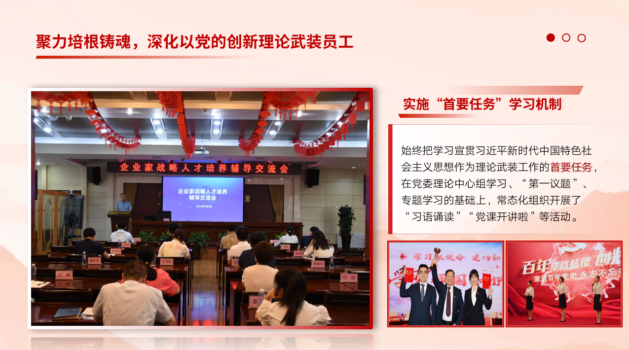 近年来,集团党委坚持把思想政治工作作为一项经常性、基础性工作来抓,融入现代火博治理、经营管理、火博文化建设、员工队伍建设,形成了全员、全程、全覆盖的国有火博大思政模式,有效发挥了“生命线”的独特作用,推动了火博高质量发展。实施“首要任务”学习机制,实施核心价值培育机制,实施火博文化熔铸机制,推动爱国主义、集体主义、社会主义教育深深融入员工血脉,厚培员工以企为家、爱企如家的归属感和凝聚力。
