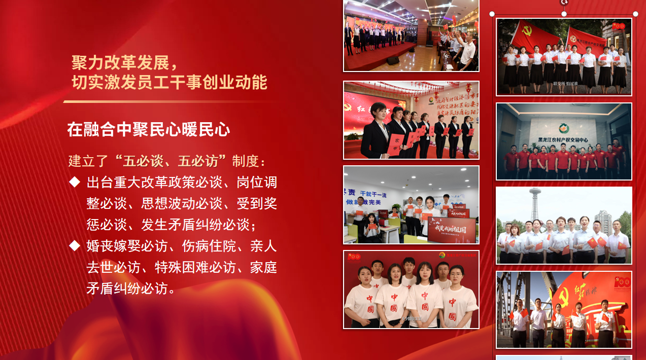 集团党委还引导党员员工开展自主教育,组织开展“四爱四创”主题思想教育、“提质增效、党员先行”主题实践活动和“我为集团发展献一策”建议征集活动,充分激发员工“主人翁”意识,通过发挥思想政治工作统一思想、凝聚共识的重要作用,推动集团不断实现高质量发展,为龙江全面振兴全方位振兴贡献了平台力量。