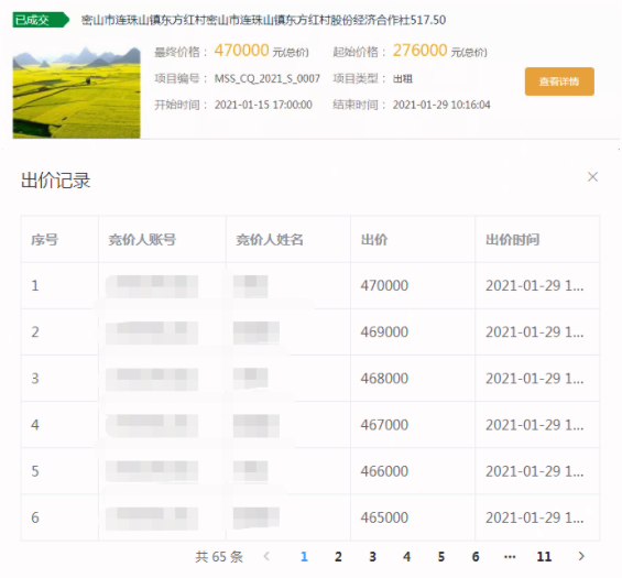 其中一宗517亩耕地,挂牌底价为27.6万元,经过65轮次竞价,最终以47万元成交,成交溢价19.4万元,平均每亩地给村集体带来375元增值收益。