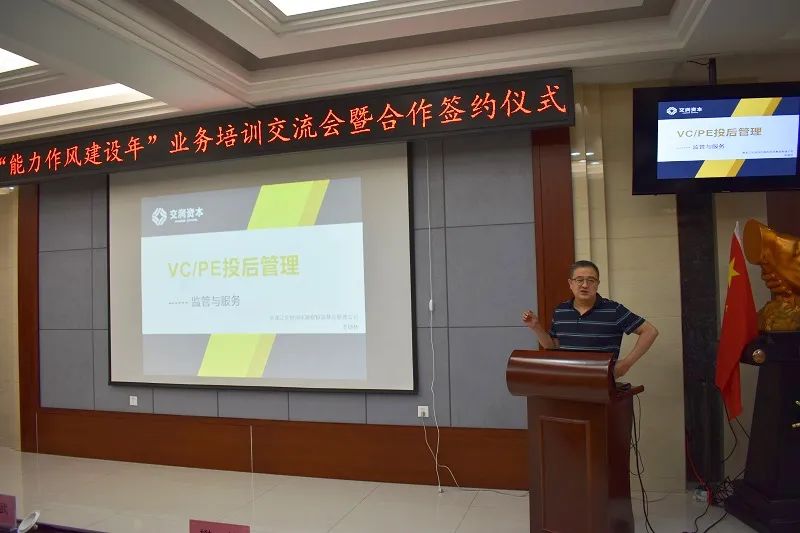 在培训交流环节,黄英杰分享了关于股权平台管理方向的几点思考,讲解了股权管理的本质、平台管理的关键、股权及平台管理的难点及应对措施、股权及平台发展趋势等;李健林分享了投后管理理论知识和实践案例,阐述了投后管理的方向、内容、要点及制约要素等;哈股交相关业务人员围绕深化我国多层次资本市场改革,解读了关于在区域性股权市场建立“专精特新”专板的相关政策背景、主要措施和未来发展趋势。
