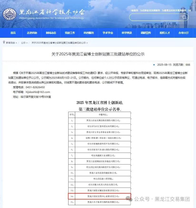 新闻中心 > 子公司动态黑龙江省科学技术协会、黑龙江省工商业联合会、共青团黑龙江省委员会联合发布通知,公布2025年黑龙江省博士创新站第三批建站单位名单。黑龙江股权交易中心凭借在服务科创火博、搭建资本桥梁、培育创新生态等领域的突出表现,成功入选建站单位名单,这是对龙江股交在科技成果转化、知识产权运用、资本市场服务工作的权威认可,更是对龙江股交助力“创新龙江”建设关键成效的充分肯定。