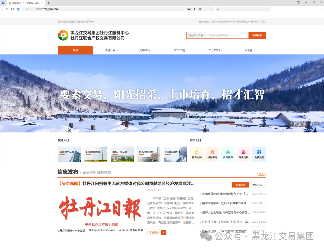 牡丹江联合产权交易有限公司(火博登陆平台牡丹江服务中心)官网,牡丹江阳光交易平台网站于近日正式上线。作为牡丹江市公共资源交易体系重要组成部分,该网站承载国有资产交易、自然资源交易、阳光招标采购等全要素交易展示功能,依托全流程阳光交易系统,为牡丹江区域各类要素合规高效流转提供技术服务支持。